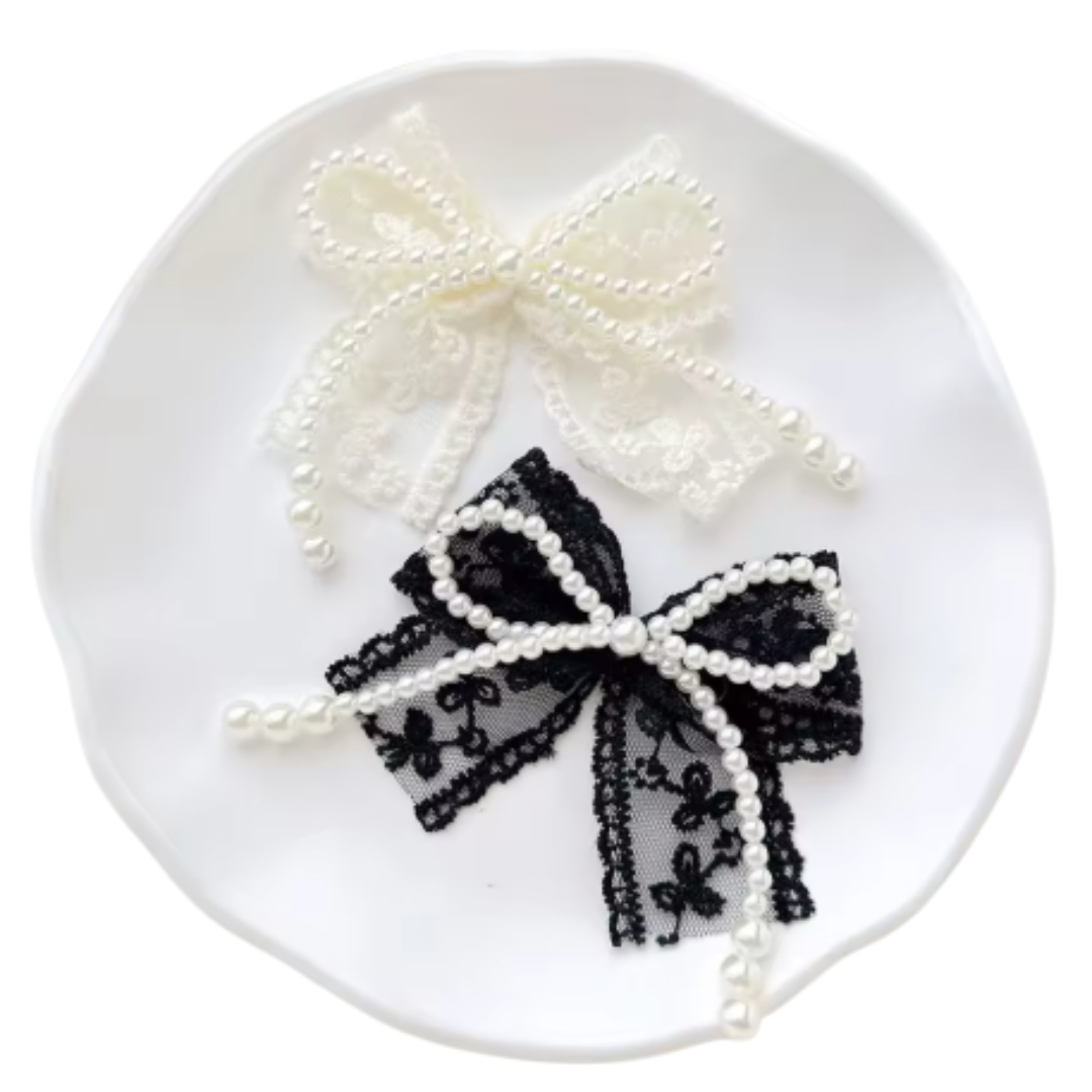 Zestaw ozdób do butów z koronką, perłami i kokardką (biała i czarna) – Stylowy Akcent do Twojego Obuwia