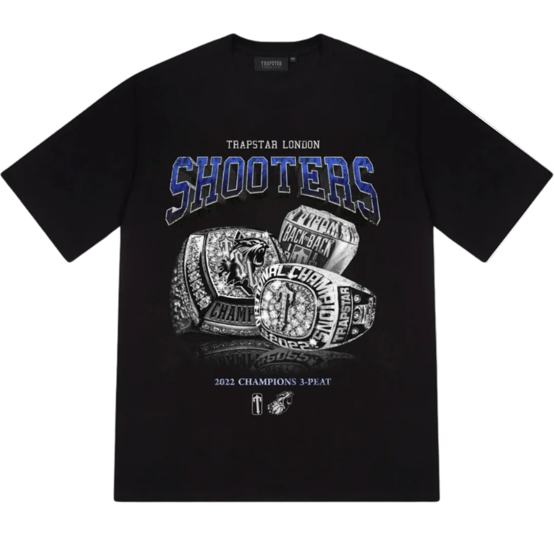 Trapstar Three-peat Champions Tee Black Blue Edition – mocny kontrast, miejski klimat